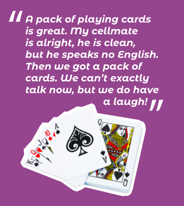 We made chess and backgammon boards, snakes & ladders and ludo boards. We made Scrabble in five languages and photocopied colouring sheets, crosswords and sudoku. Generous donors and the prison authorities gave us small grants and we bought what we couldn’t beg for - felt tips in bulk, playing cards, chess pieces and counters in bulk. We had enough books to keep 14 book trolleys full and interesting - we were even able to supply books for four other prisons.