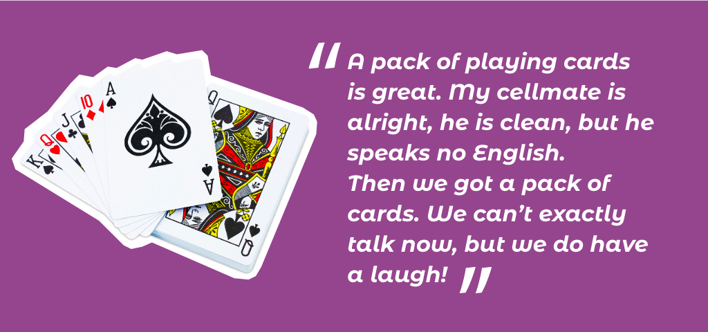We made chess and backgammon boards, snakes & ladders and ludo boards. We made Scrabble in five languages and photocopied colouring sheets, crosswords and sudoku. Generous donors and the prison authorities gave us small grants and we bought what we couldn’t beg for - felt tips in bulk, playing cards, chess pieces and counters in bulk. We had enough books to keep 14 book trolleys full and interesting - we were even able to supply books for four other prisons.